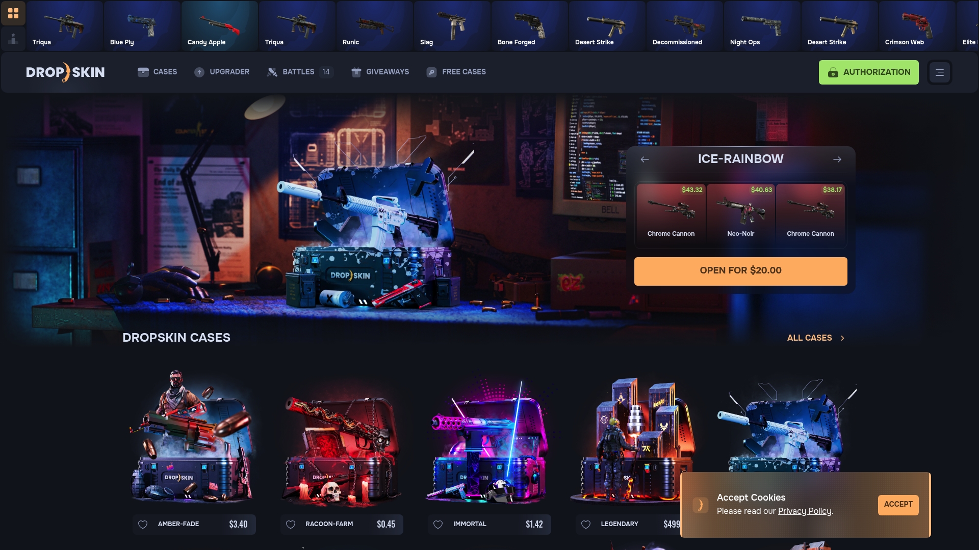 DropSkin is the leading online platform for CS:GO skin trading and entertainment, combining case openings, battles, upgrades, and a skin changer in one place. It prioritizes community engagement with giveaways, promocodes, and an expansive case collection.