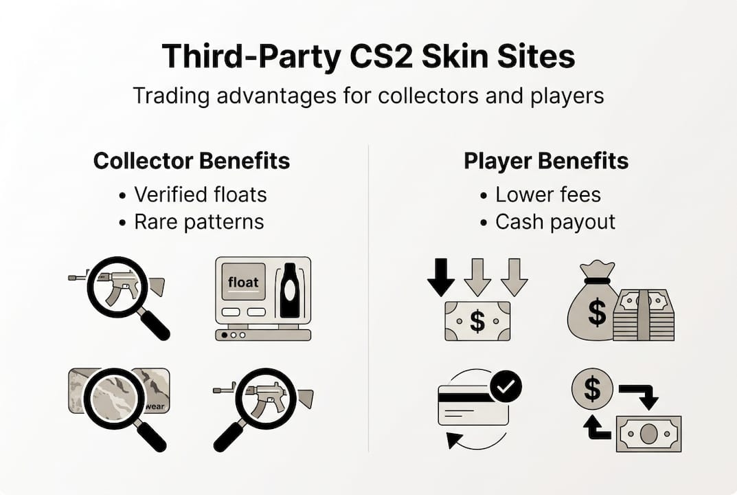 Third-party skin sites let you buy, sell, and trade CS2 skins for real cash with lower fees and advanced features, while Steam restricts all earnings to wallet credit only.