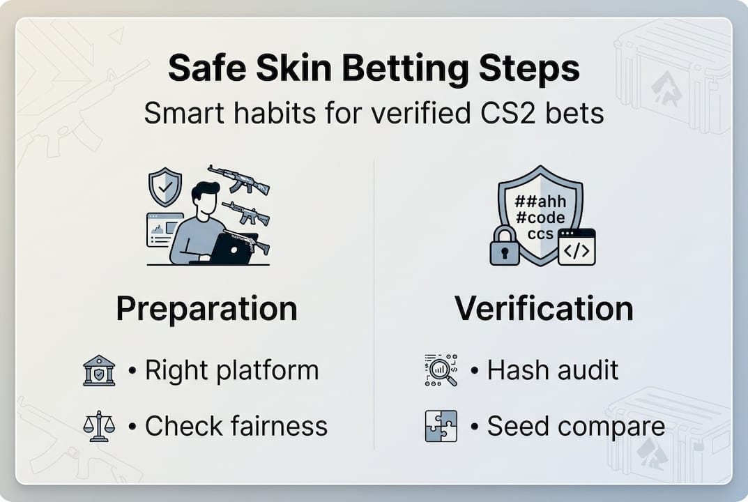 Skin betting in CS2 and CS:GO is one of the most exciting ways to turn your inventory into something bigger, but the process trips up more players than you'd expect. Skip one step, trust the wrong platform, or ignore fairness verification, and you're risking real value on a bet you can't confirm was ever fair. This guide walks you through every stage of a safe, smart skin betting workflow, from setting up your account to verifying your results with cryptographic proof. Whether you're placing your first wager or tightening up an existing routine, you'll finish this article with a process that protects you and keeps the experience genuinely fun.