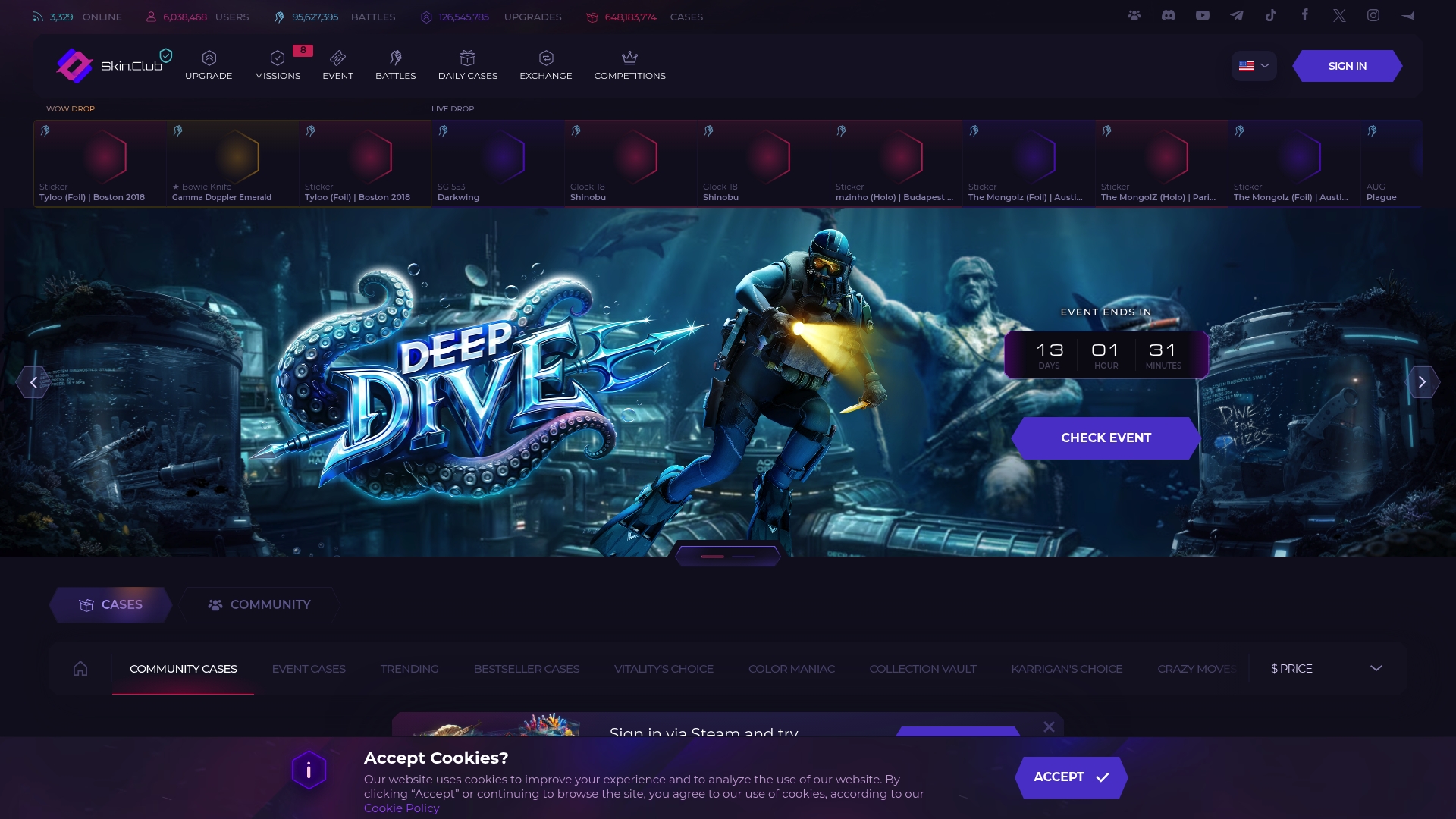 Skin.Club offers case opening, skin upgrading, and a full trading suite with automatic Steam bot transactions to move items without manual steps. Multiple payment options let you deposit with credit cards, skins, and other supported methods while the Provably Fair tools let you validate outcomes.