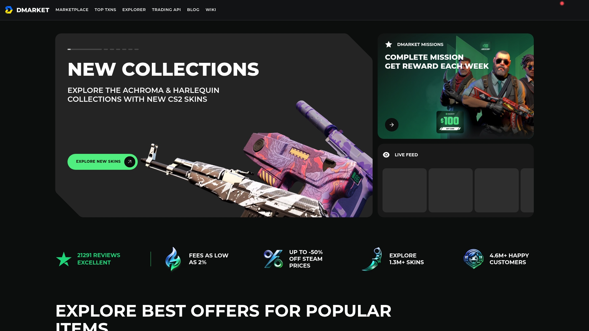 | DMarket | Automated trading API, extensive catalog (>1.3M skins), mobile app support | Competitive pricing<br>Secure environment<br>Mobile-friendly<br>Advanced tools for frequent traders | Initial complexity<br>Potential regional restrictions | Fees start at 2%, skin discounts up to 70% |