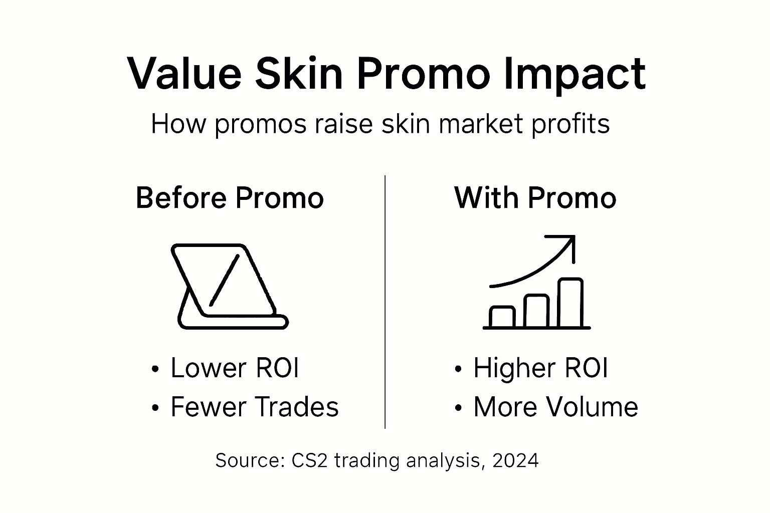 Value skin promotions generate measurable economic effects on the CS:GO and CS2 trading markets. Value skin promos increase trade volumes by up to 25% and boost market liquidity and accessibility, transforming how players engage with skin markets.
