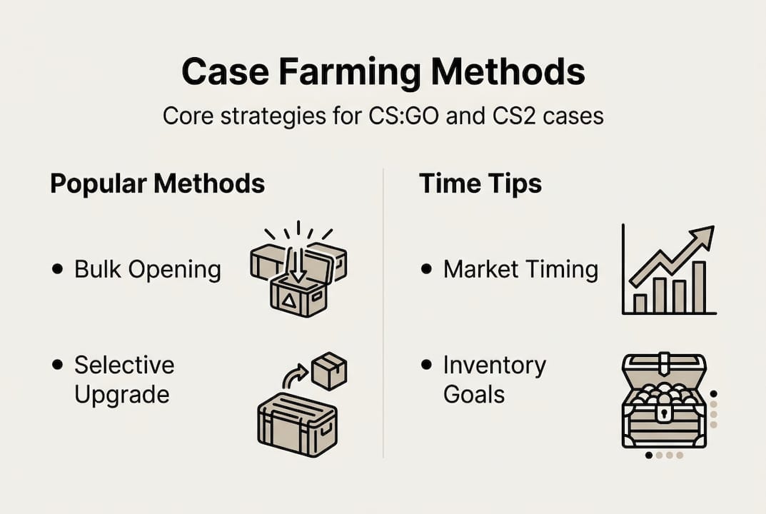Many gamers confuse case farming with casual case opening, but they're fundamentally different activities with distinct goals and outcomes. Case farming is a strategic approach to repeatedly opening cases with specific objectives like building a tradeable inventory or enhancing gambling strategies. This guide clarifies what case farming really means, how it impacts your skin trading and gambling efforts, the methods that work best, and the risks you need to manage. Whether you're looking to grow your collection or maximize trading profits, understanding case farming is essential for success in CS:GO and CS2.