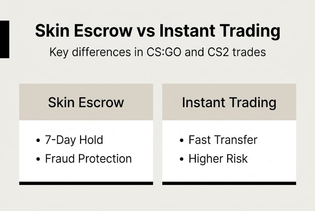 - Skin escrow temporarily holds items to prevent rushed or fraudulent trades.