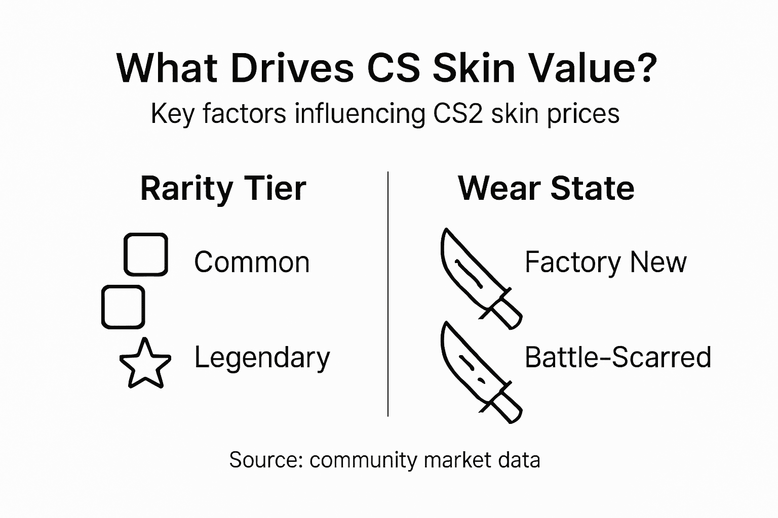 - Condition: Wear levels dramatically impact pricing (Factory New vs Battle-Scarred)